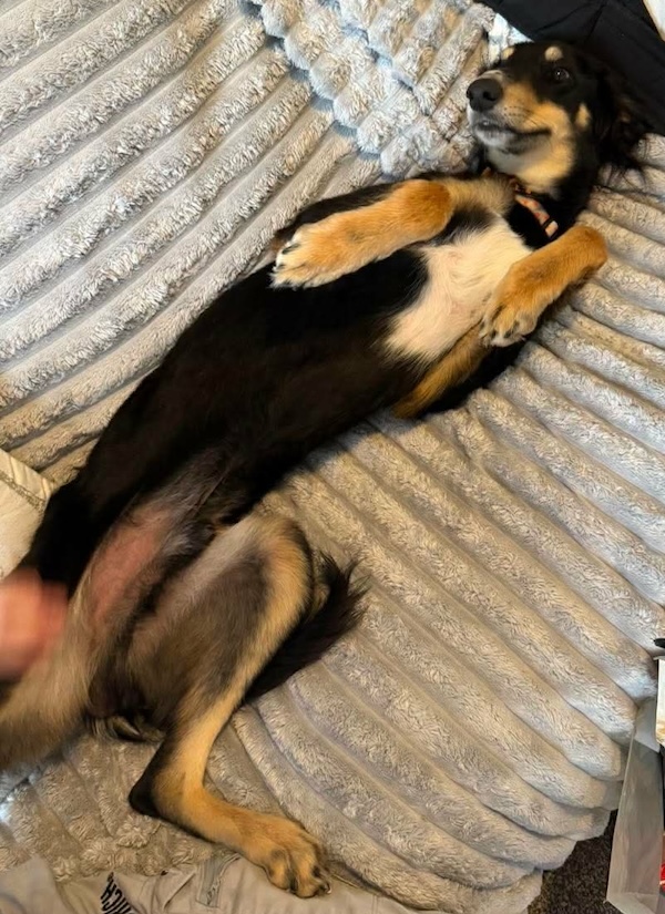 Bailey loves people and loves lots of fuss, being stroked on the underside of his throat, and belly rubs, and stroked behind his ear. He likes to lounge on the sofa between people and do various yoga poses with his long legs while sleeping, being petted or lazing. He likes to play with his toys inside and loves small regular bouts of (10 mins) fetch games in the garden with his balls. After 10 mins he will return to sniffing or bird watching. He loves human visitors, and does not bark when the door knocks.