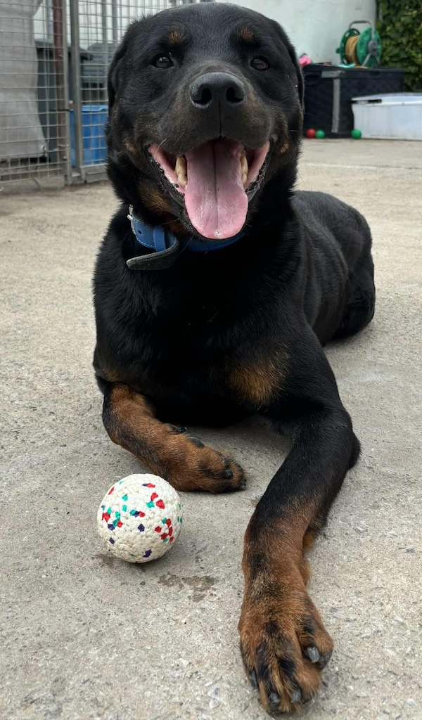 Boris is a very lovely, sweet natured boy. He loves to play with a ball and gentle tug of wars with rope toys, but doesn’t snatch toys. He knows all the basic commands, including: ‘sit’, ‘paw’, ‘lie down’, ‘wait’ and when he’s playing with a ball, if you say ‘drop’, he drops it at your feet. He also walks nicely on the lead, but can show interest when he sees other dogs. Some dogs he reacts to and some he doesn’t, so for this reason, we feel Boris should not be re-homed with other dogs.