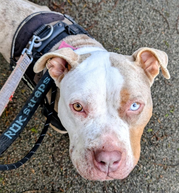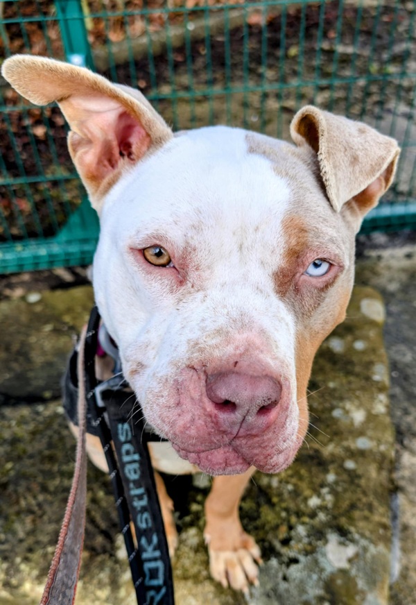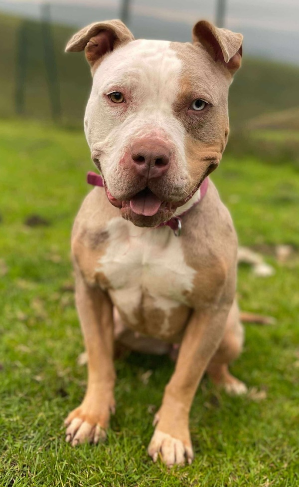 Cookie is a very warm hearted and affectionate character, and she deserves a loving home surrounded by people who look at her the way she looks at you. She shows affection by bringing you pillows, sitting herself on your knee and planting her soft lips on your face! She can be a little pushy with her love, especially when other dogs are involved, so we would like her to be rehomed as an only dog. However, outside the home on walks and inside the home for shorter periods of time she’s proven to be great with other dogs, thoroughly enjoying playing and saying hello to everyone she meets.