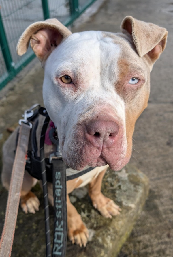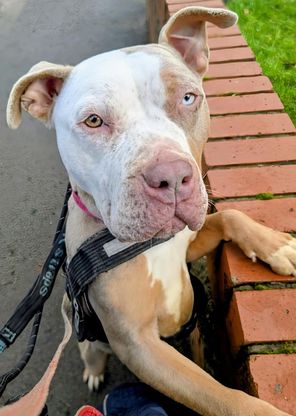 Cookie is a lively and affectionate dog with a lot of love to give. She bonds closely with her people and thrives on attention, companionship, and playtime. She’s intelligent, eager to please, and has a goofy, puppy-like charm that brings joy to those around her. She’s great at cuddles, loves one to one time, and has a playful side that emerges once she feels safe and secure. Cookie is very food orientated, and although she is getting better at this you do need to watch your fingers, especially if there’s other distractions (or it’s her favourite treat). She is also sensitive to grains and meat fed on grains in her food, so the vets have suggested dog food with salmon/lamb to avoid any allergic reactions.