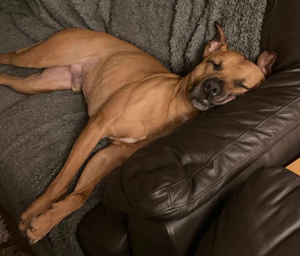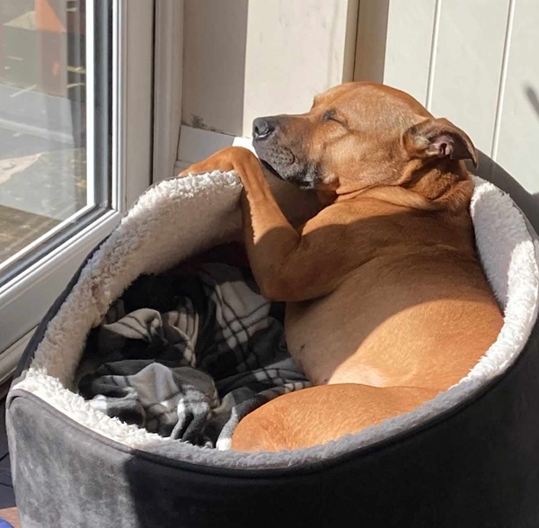 Rico loves his walks, out sniffing around but also happy with sofa/duvet times – he really is the best companion. He likes to know what is going on – watching out the window or patrolling the back garden making sure no squirrels trespass! He is an excellent guard dog.