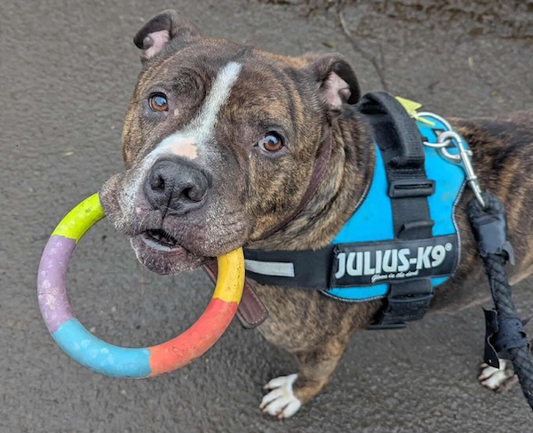 Ted is a 10 year old staffy cross who came to us after his owner died. Ted had been a much loved pet and his late owner’s family were devastated to have to give him up. Ted is cat friendly and has lived with a couple of cats without any issue at all. In fact, he was in awe of them and didn’t bother them at all.