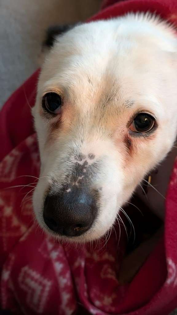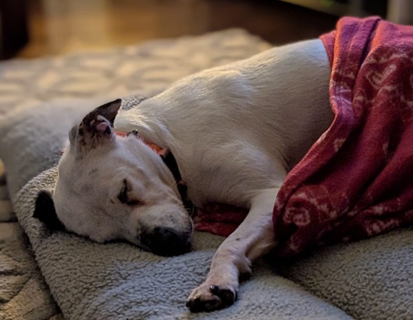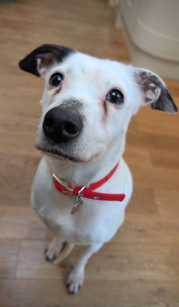 Lucy is a lurcher X approximately 7 years old. At the time of writing this (December 8th) we have been fostering Lucy for two weeks. When she arrived, she was in a state of shock but has now really blossomed. Lucy is completely house trained and walks really well on a lead. She loves to be near us and enjoys a fuss but is happy to lie on her bed and snooze. She has some separation anxiety which we’re working on, and we’ve discovered she is happiest left in a crate. Lucy is wary of visitors to the house and particularly men. It takes a couple visits and a few treats for her to relax and interact with our friends & family.