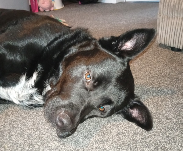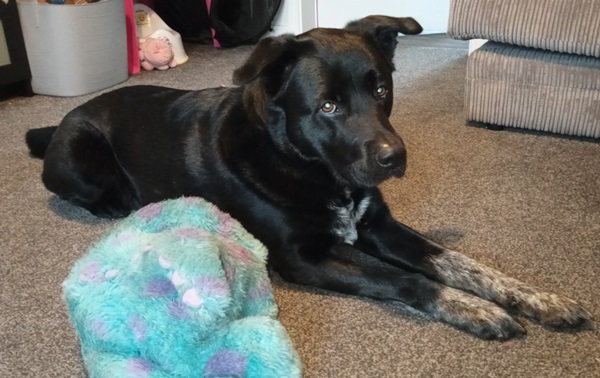 Since he’s a big lad this can come over as intimidating and therefore any new owner will need to be mindful of this. He’s very nervous with louder sounds when out and about – motorbikes, trains trucks, tractors etc but for some reason loves fireworks. He’s clean in the house and non destructive. He can be left for periods of up to 4 hours at a time without any issues.